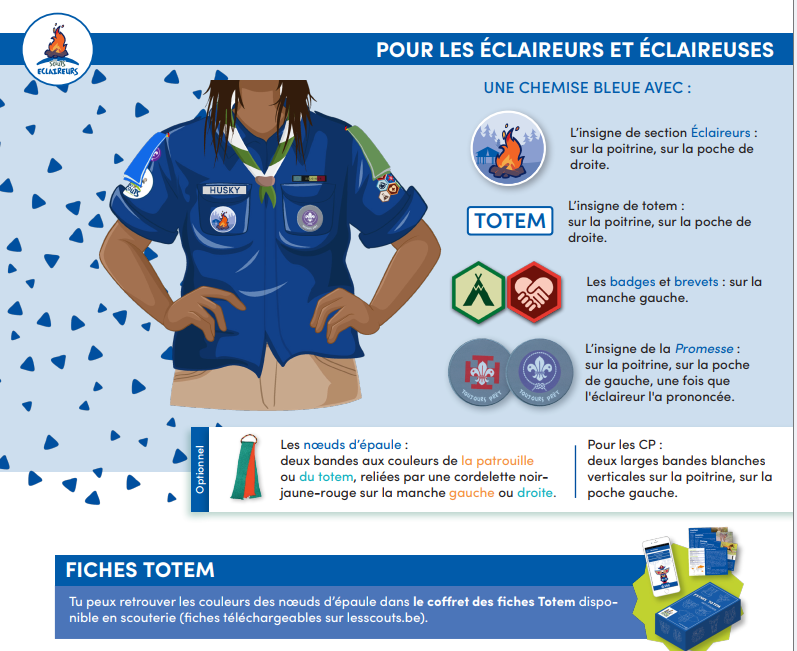 L’uniforme scout L’uniforme louveteaux se compose comme suit : Le foulard bleu et blanc de la 34éme BW Une chemise bleu marine Un short (si la température extérieure dépasse 0°C) De bonnes chaussures (baskets ou bottines)